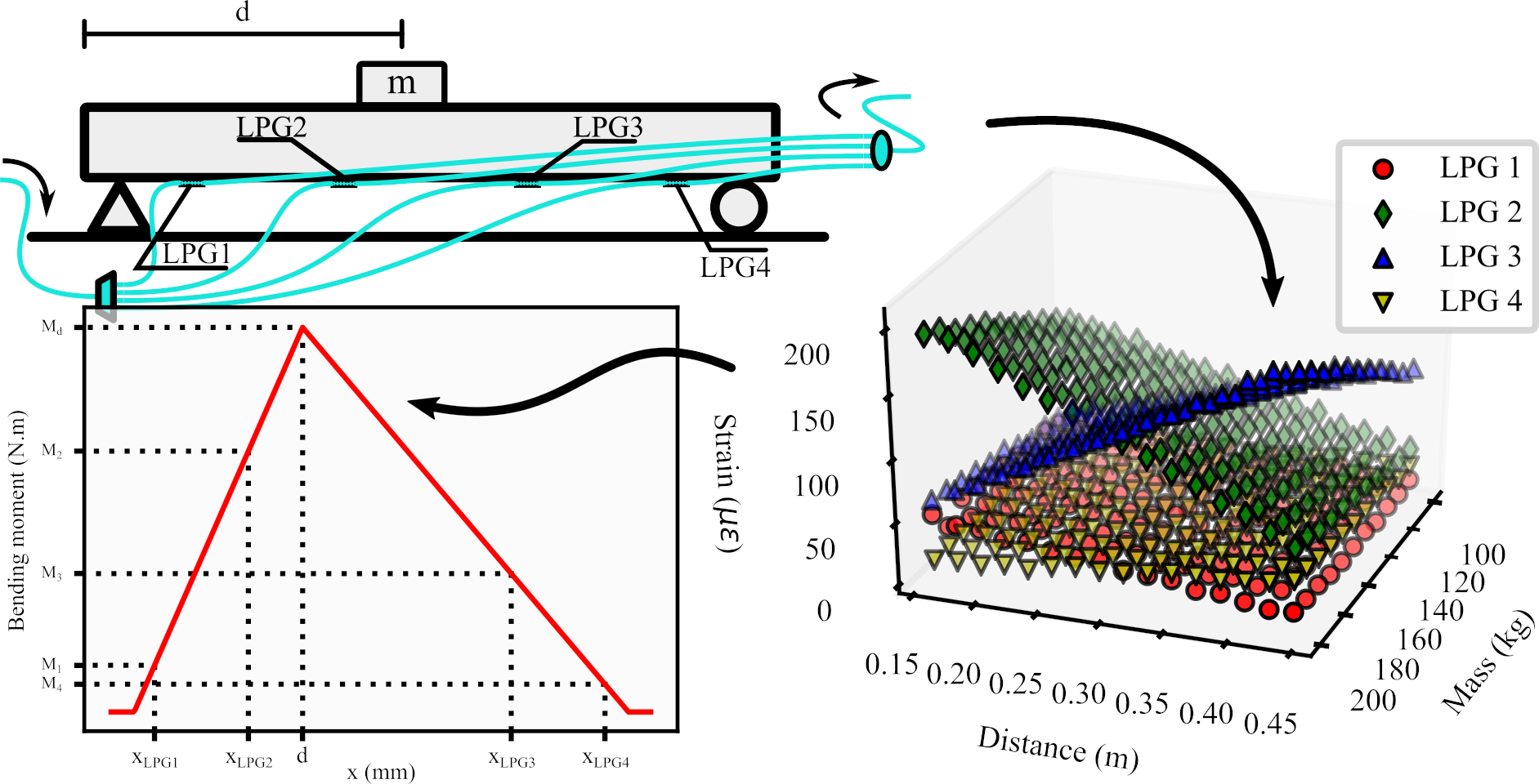 Utilizamos um arranjo de quatro LPGs para monitorar a deformação em uma viga biapoiada e estimar a intensidade e a posição de uma força aplicada à viga. Os resultados mostraram que a posição da força pode ser estimada com uma precisão de 0,901% e a intensidade da força com uma precisão de 2,51%.